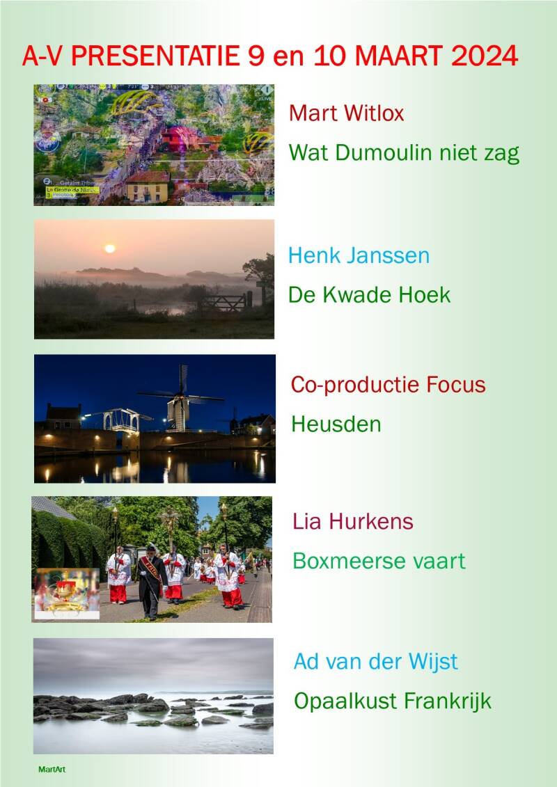 Zoals gebruikelijk zijn er ook weer vijf AV (audio visueel) series te bekijken. Graag nodigen wij u uit te komen kijken in Boszicht, Bernhardstraat 72 te Boekel. De expositie wordt op zaterdag 9 maart geopend door wethouder Ben Brands. We zijn beide dagen te bezoeken van 11.00 tot 17.00 uur. Graag tot dan!